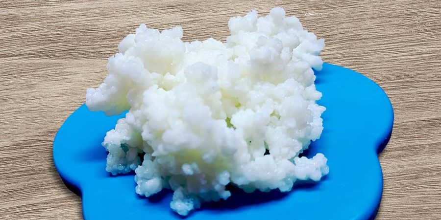 Esta bebida se produce poniendo a la leche en contacto con los granos de kéfir de leche (figura 1), que popularmente se conocen como” búlgaros”. Su color va de blanco a cremoso y su tamaño generalmente es de 0.2 a 2 mm. Si a estos granos les tomamos una fotografía con el microscopio electrónico, podremos observar una gran cantidad de microorganismos probióticos asociados a un carbohidrato llamado kefirán (figura 2), que está compuesto por glucosa y galactosa, dos azúcares que se encuentran en la leche y que se unen entre sí formando largas cadenas de carbohidratos; una porción de la molécula de kéfir se observa en la figura 3.