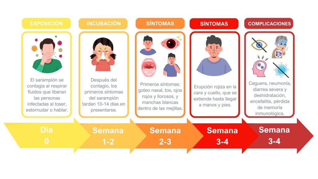 Los síntomas típicos del sarampión incluyen fiebre, tos, flujo nasal, ojos rojos, manchas blancas en el interior de las mejillas y erupción rojiza en todo el cuerpo, que van apareciendo conforme avanza la enfermedad. Además, en casos graves puede ocasionar encefalitis, y entre 2 y 3 de cada 1,000 casos pueden resultar en daño cerebral o muerte.2