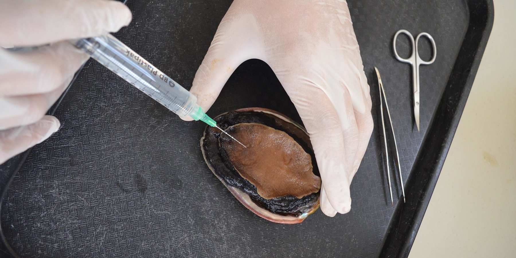 Ante la ausencia de tratamientos alternativos efectivos, el doctor Cáceres Martínez realiza experimentos inyectando las nanopartículas de plata intramuscularmente en abulones –cuyo sistema de circulación las distribuye por todo el cuerpo– para ver su efecto en los tejidos, la posible bioacumulación de las nanopartículas y su efecto sobre el agente causal del síndrome de deshidratación.